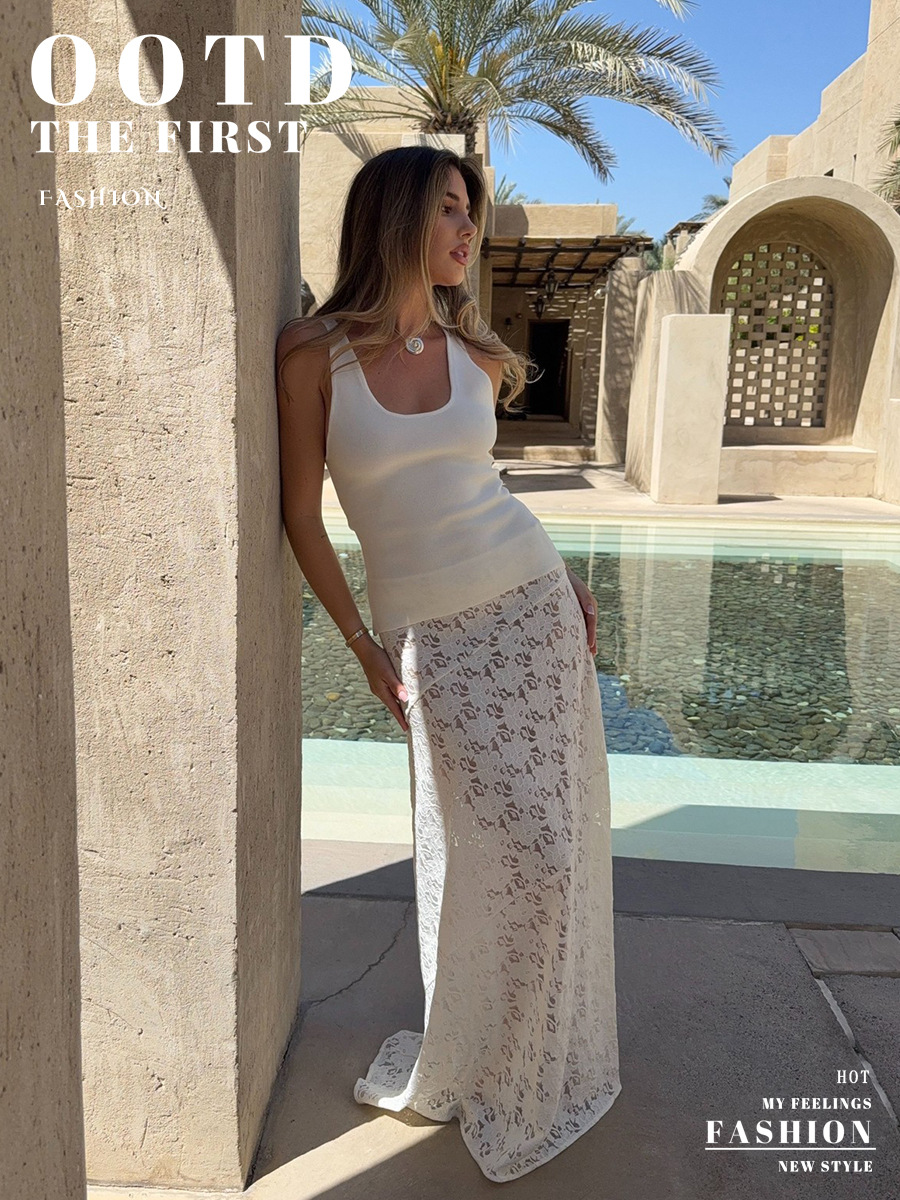 White Jacquard Sheer Low-Waist Lace Skirt